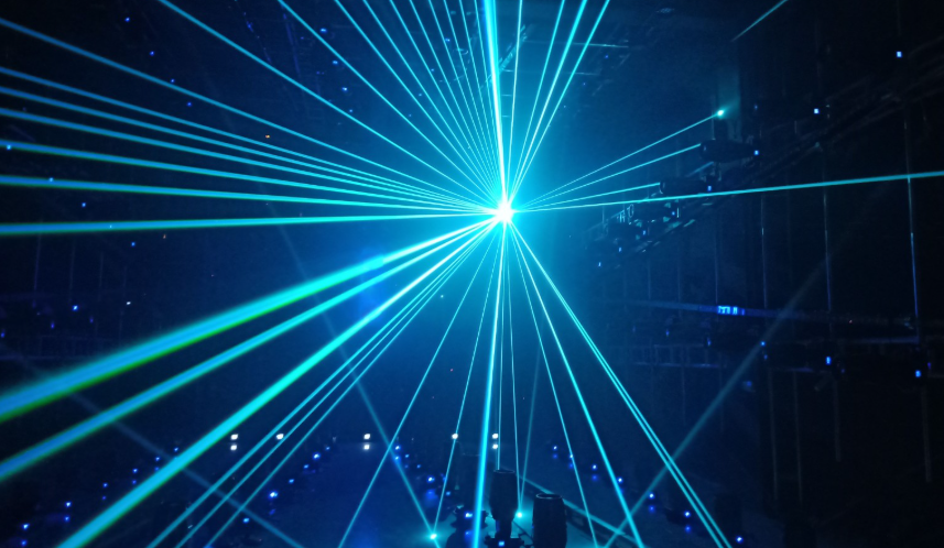 打在隐形幕,小山或建筑上形成动物跑,飞鸟鱼游效果。配合位置感应器,形成互动光束,互动水秀,互动游戏效果